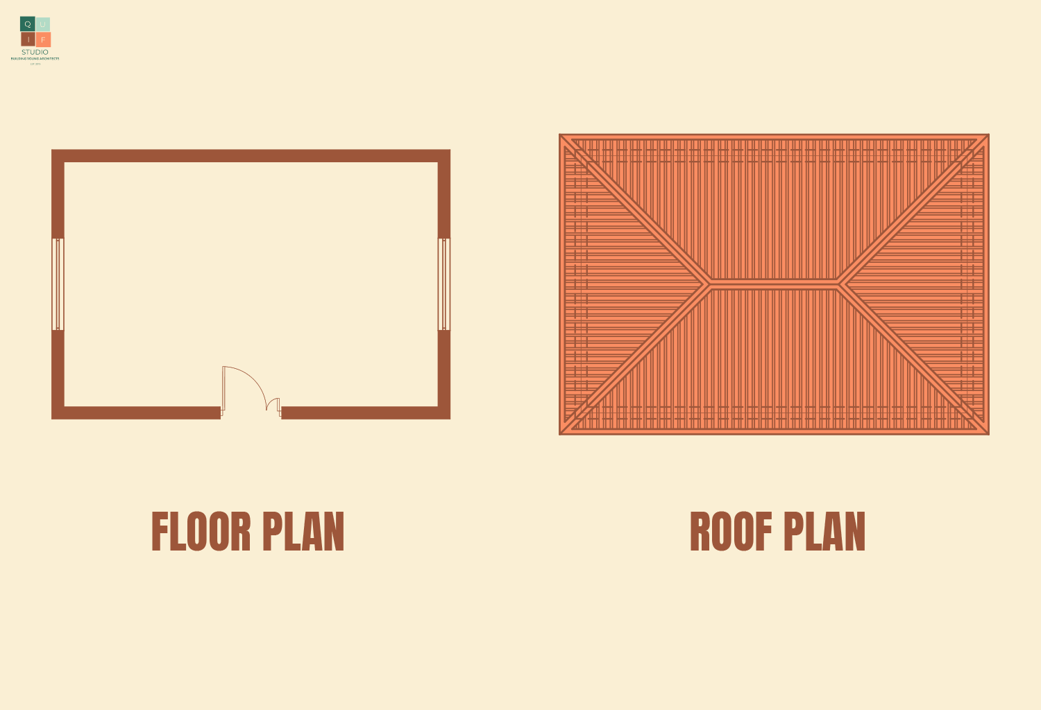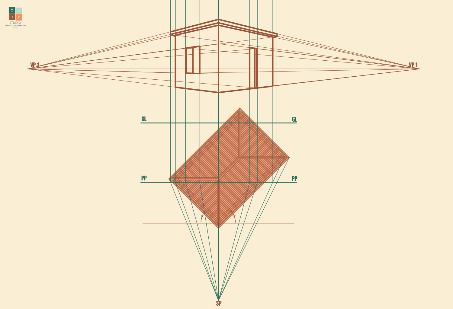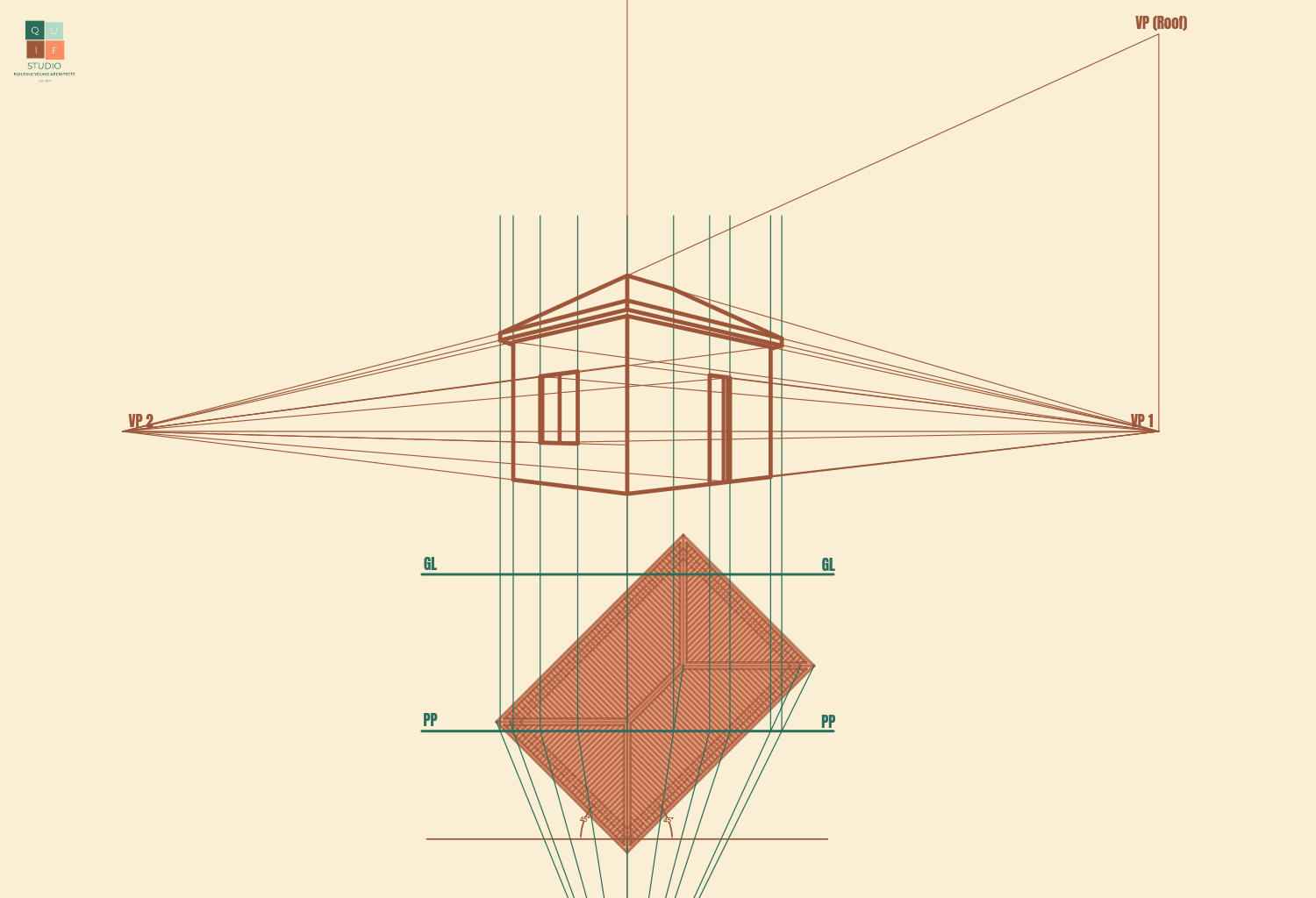 For the roof, we can use the plan to identify where the roof lines will be through projection. However, hip roofs generally have a different vanishing point from the building. This is because lines of roof do not run in a perpendicular or parallel manner, they slope towards various directions.