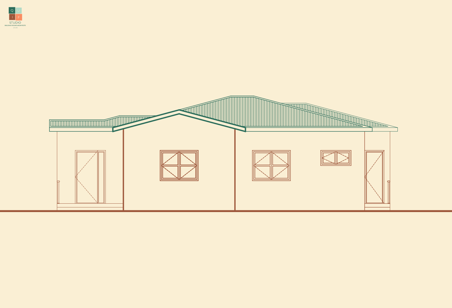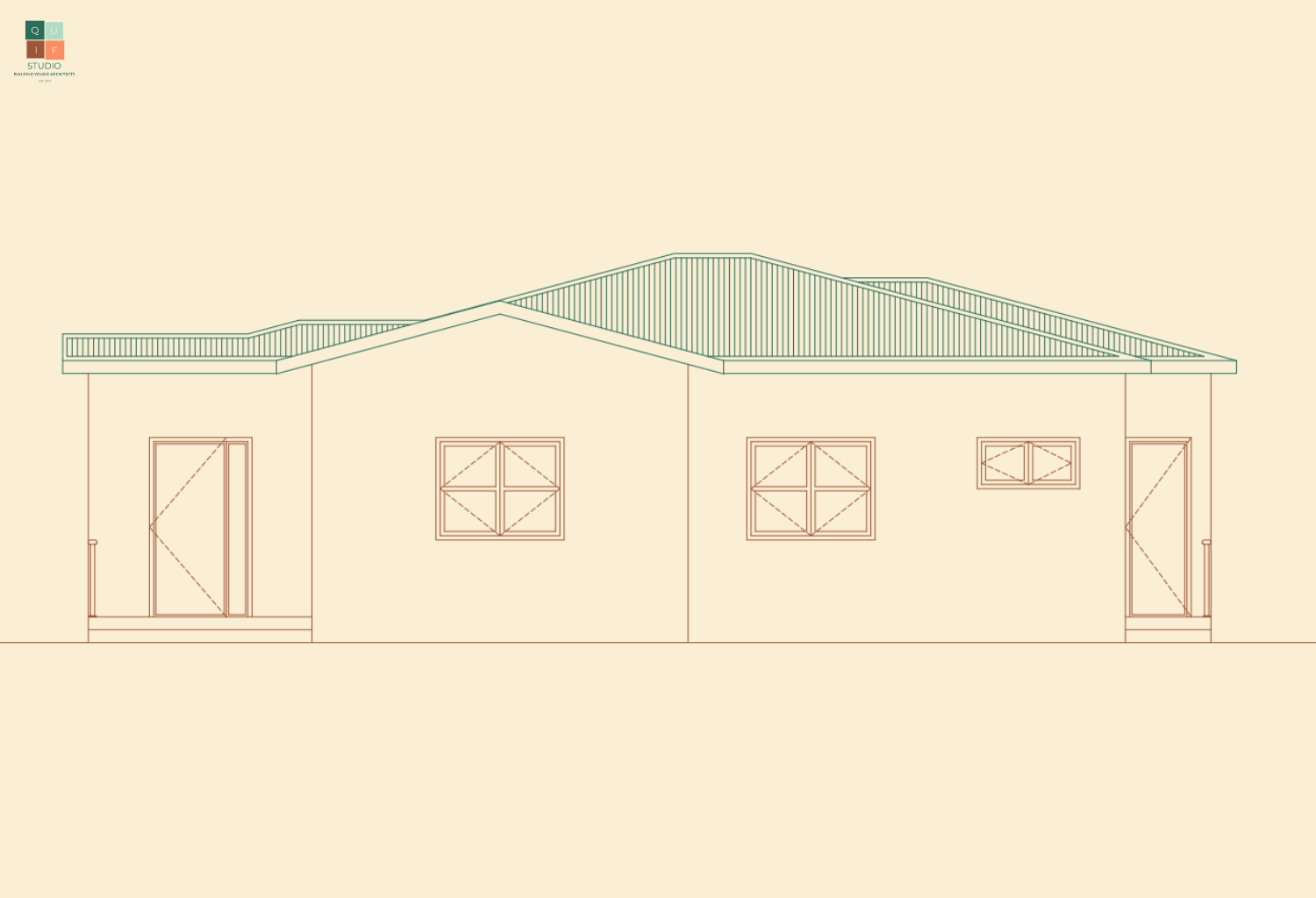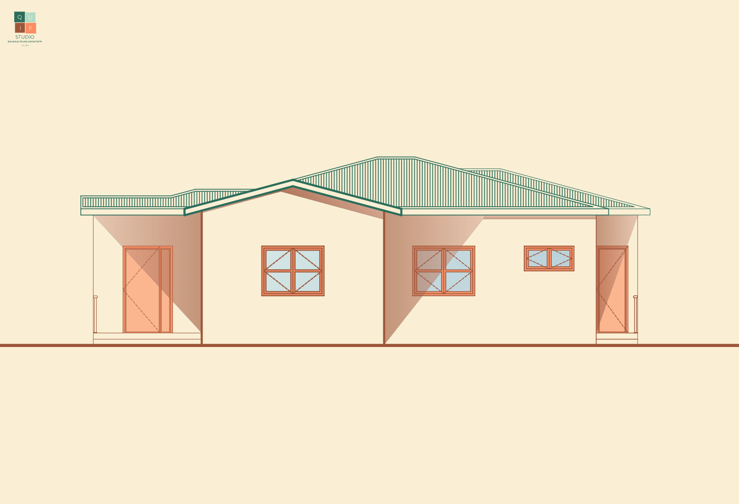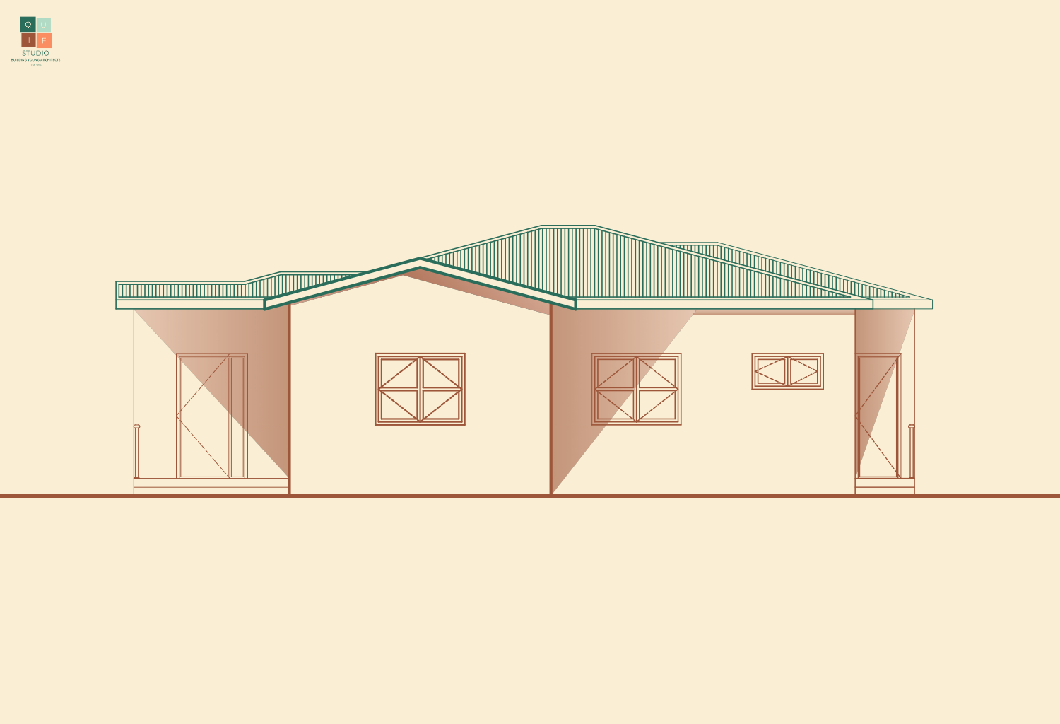 For the roof, we can use the plan to identify where the roof lines will be through projection. However, hip roofs generally have a different vanishing point from the building. This is because lines of roof do not run in a perpendicular or parallel manner, they slope towards various directions.