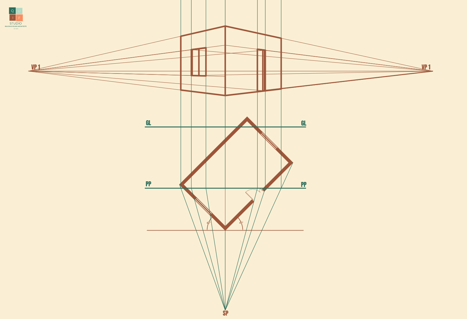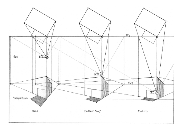 The distance of the spectator or the SP from the object can also have an effect on the drawing. Imagine holding a box in your hand along your eyesight level. The closer the box gets to your eyes, the less you can see. If the box is an arm’s length from your eyes, you will perceive the view of the box better. If the SP is close to an object, the more compressed the drawing becomes. If the SP is further away from an object, the view of the object become wider.