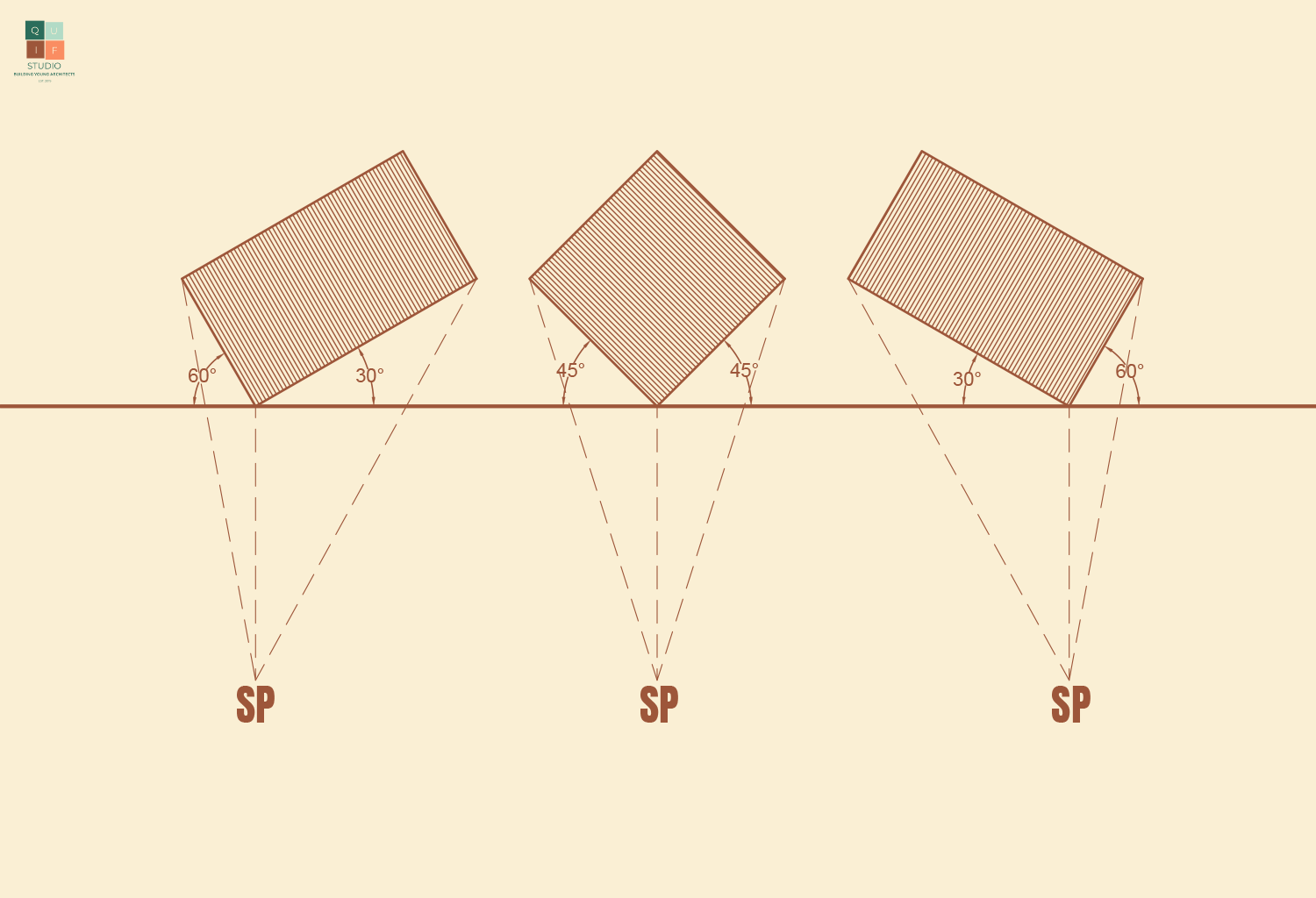 From the diagram above, the second option will reveal both sides of the building evenly for a more pleasant perspective drawing/image. Therefore, we will adopt that angle of view.